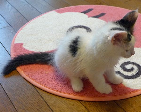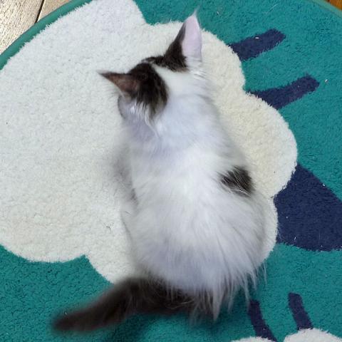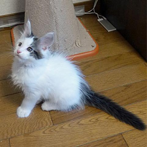 白が多いブラウンタビー&ホワイトの男の子。とても、人懐っこく、食欲旺盛。