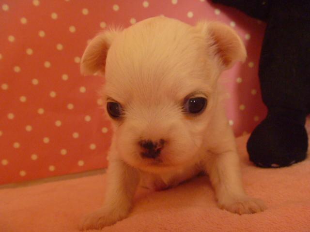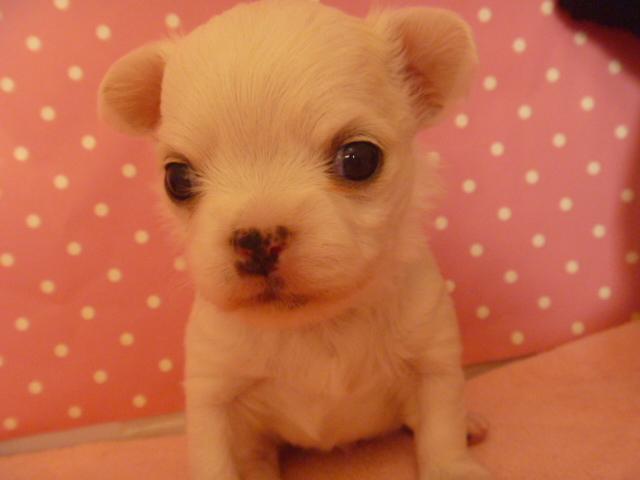 チワワでは珍しいホワイトカラー、将来は可愛いワンチャンに成長するでしょう。
