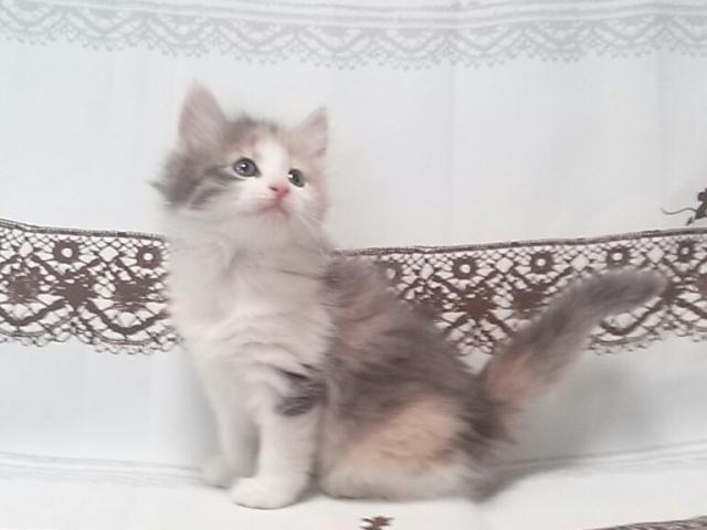 この仔猫さんは4月15日生のサイベリアンのおんなの子で、カラーはダイリュートキャリコです。人懐こく優しい性格でとてもお利口さんです。