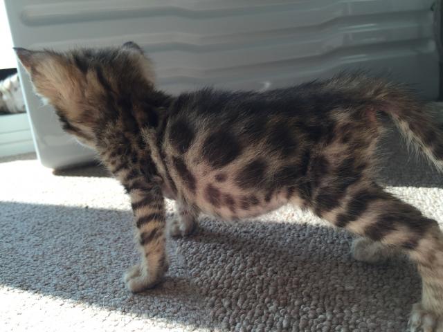 イエネコでロゼットを持っているのはベンガル猫だけです。ロゼットとは、違いが明らかな2つのカラーまたは色調を持つスポットまたはマーキングのことを言います。また、手触りのしっとりとしたシルクやミンクのような美しいコートをしています。ボディはロング&サブスタンシャルタイプで、筋肉質のがっしりした体型です。大きく開いた耳、たくましい頭、大きなボディーにバネのある四肢をもち、全体的なイメージは野生味に溢れています。