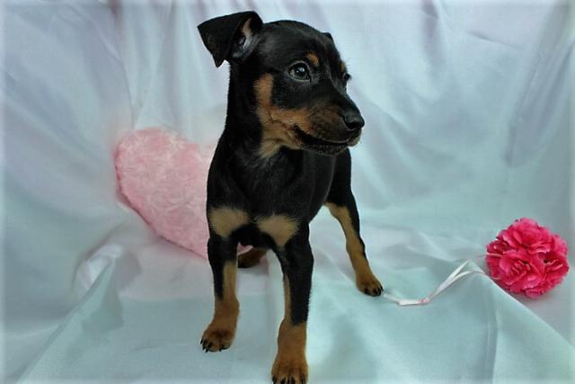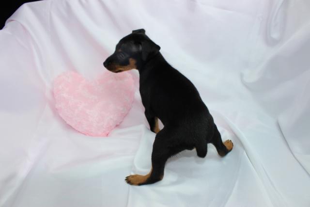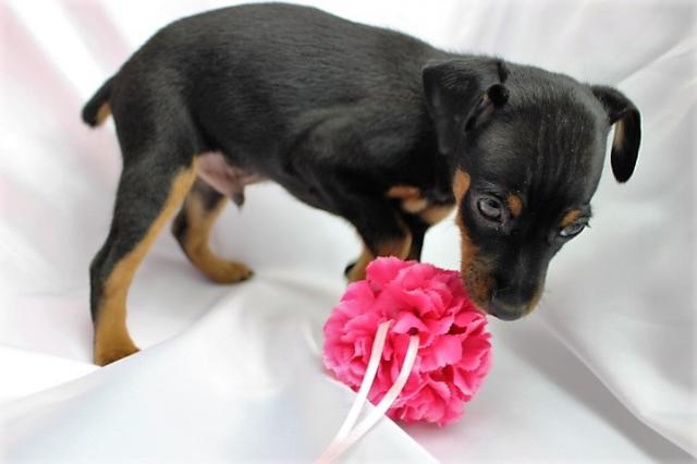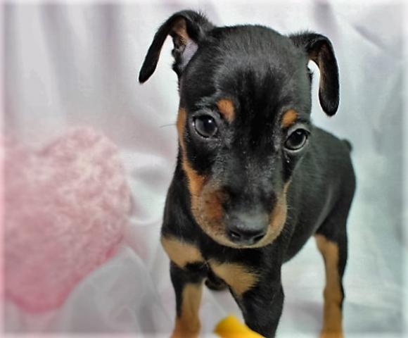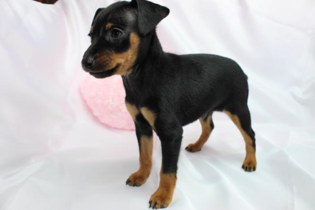 ミニチュアピンシャ―、ブラックタンの男の子。 パパはチャンピオン直子の超良血統。チャンピオン