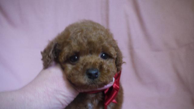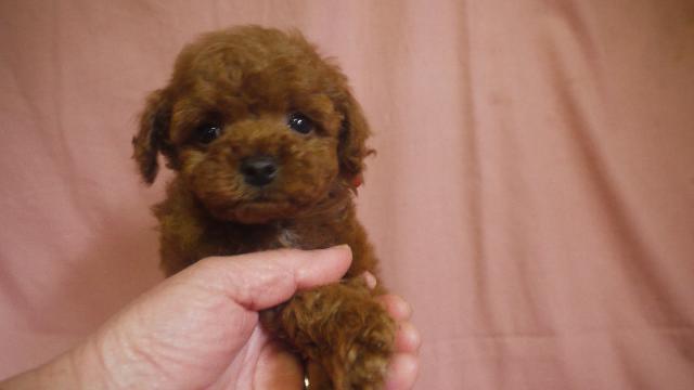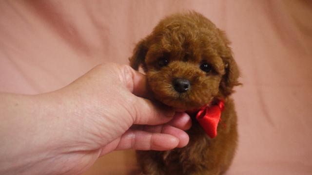 最高に可愛い男の子。カラーは、濃いレッドお父さんお母さん共2キロちょっとのサイズです。1頭子だったので現在テーカップではありませんが、2キロ前後で収まると思います。