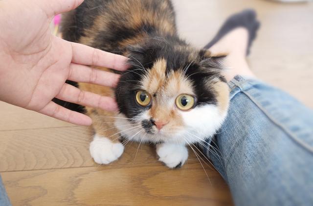 耳が垂れている三毛猫のぶちにゃんは、ツンデレなところが愛嬌のある女の子です。