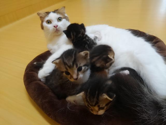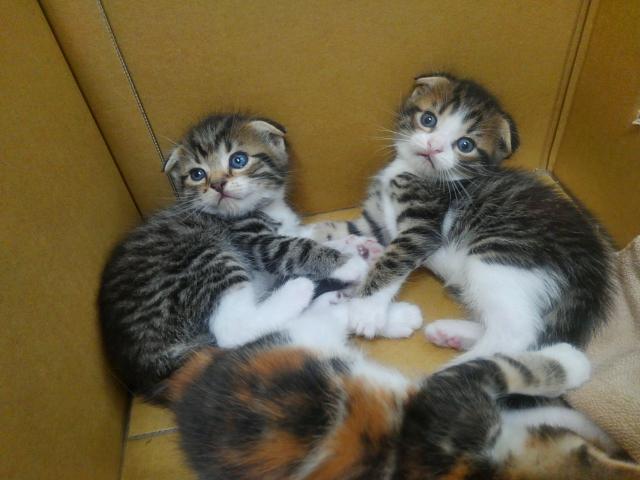 父アメショーのレッドタビー、母スコティッシュ(耳折れ)ブラウンタビー&ホワイトのカップルが生まれたオス3頭メス1頭の兄妹です。