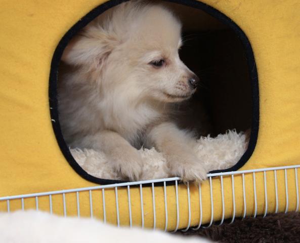 小柄な生育ですが、大きい子とやんちゃさんを負けずにする、元気溌溂の子です。(パピーの部屋の番長のダックスの後を追いかけて運動会をしています。)