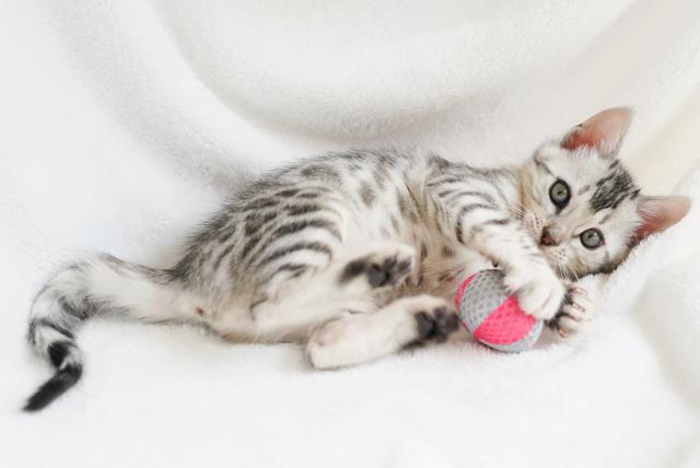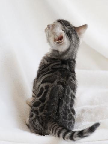 銀色の被毛に、はっきりした大きめのロゼットがとても美しい仔猫です。