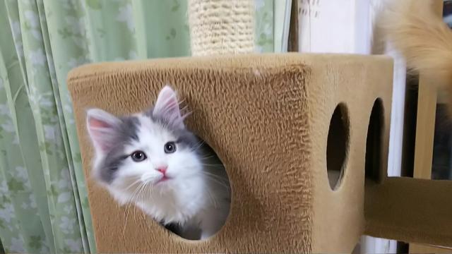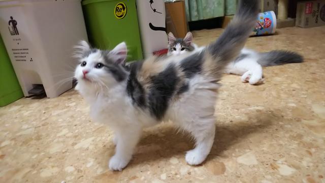 綺麗なハチワレのミルクティーのような明るくて柔らかなカラーのノルウェージャンフォレストキャットの子猫です。