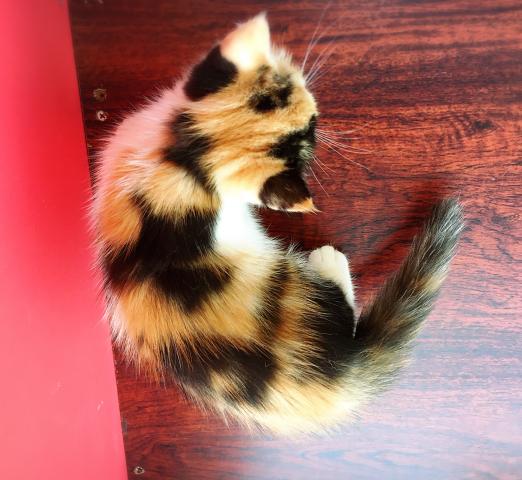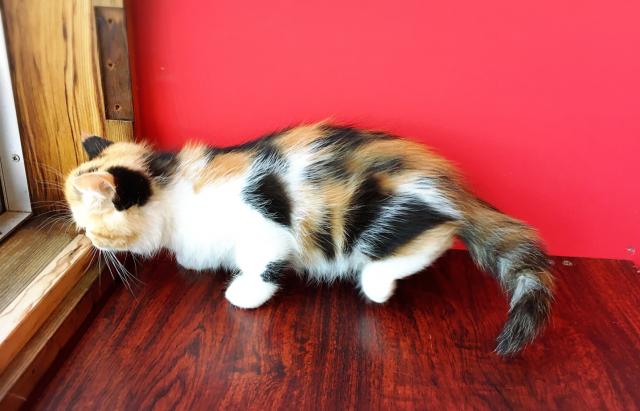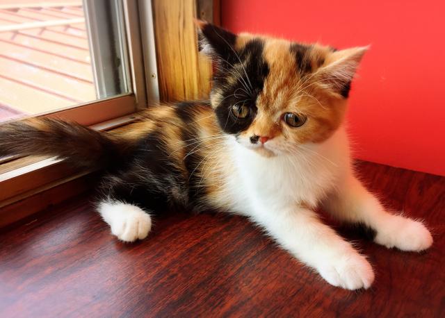 キャリコの毛色で鼻の下にポイントのある可愛い女の子です(*´ω`*)