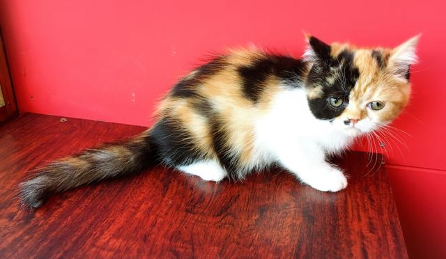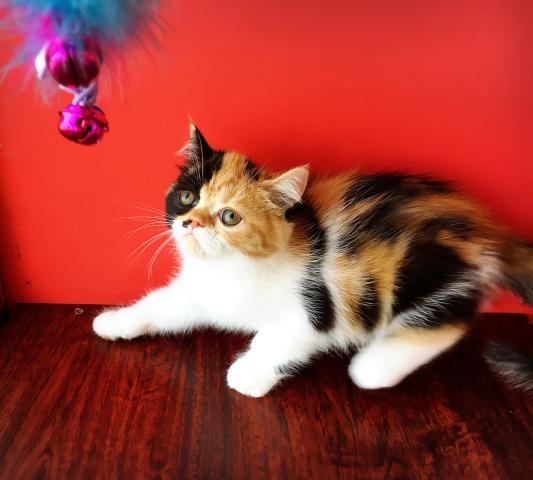 キャリコ(ブラック&ホワイト&レッド)の毛色をしたエキゾチックショートヘアーの女の子です(*^^*)