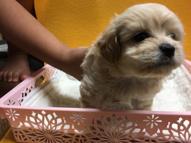 お父さんプードルお母さんペキニーズのプーペギ君です。離乳食をもりもり食べ元気に兄妹と生活してます。足が短くてお鼻がつまっててお顔がまん丸でめちゃ可愛いです。珍しいMIX犬が欲しい方は是非お問い合わせ下さい。