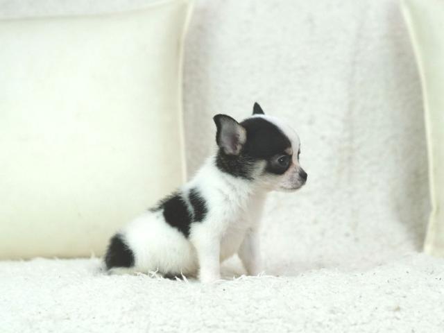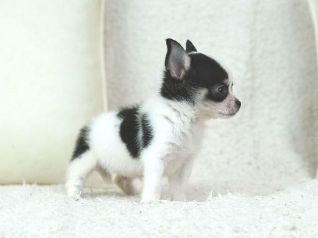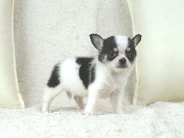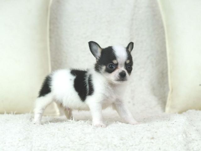 これだけお顔が整っていて毛色もとっても綺麗に白と黒の模様が入っているチワワ君は珍しいですよ。きっとあなたも一度会えばこのチワワ君の虜になる事でしょう。現在、お腹いっぱいしっかり食べていてとっても元気に遊んでいます♪健康状態も良好そのものです。是非一度お問合せ、ご見学頂ければご案内致しますのでぜひぜひ♪