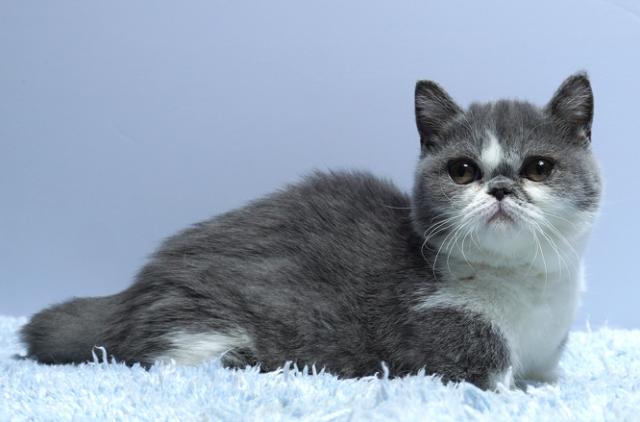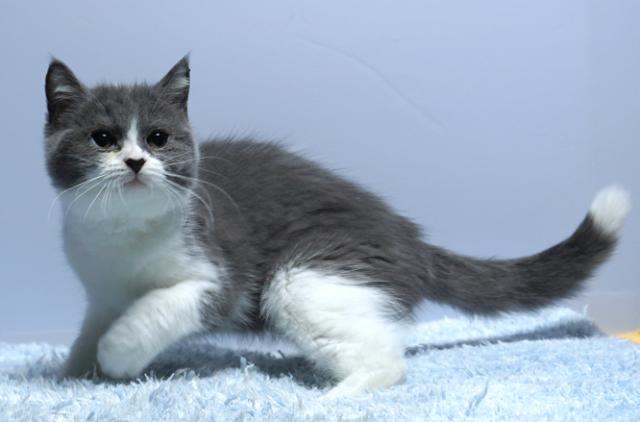 短足マンチカンの男の子です。ブルー&ホワイトできれいなはちわれのハンサムボーイ。優しそうなお顔に癒やされます。