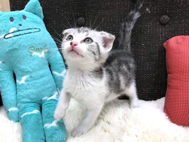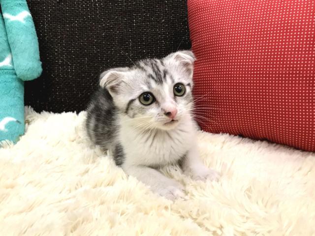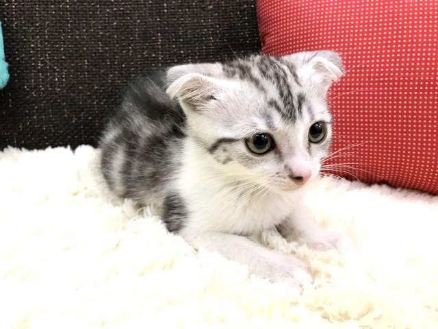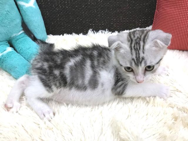 <b>毛色はまるでアメリカンショートヘアの猫ちゃんみたいですが、耳がペコっと折れたスコティッシュフォールドの男の子のご紹介</b>