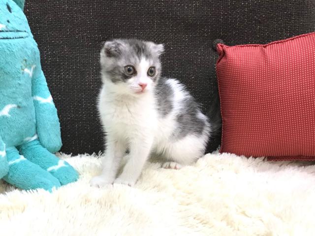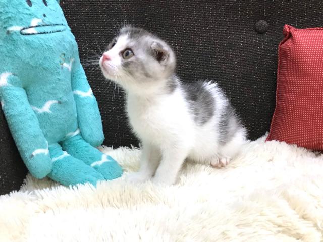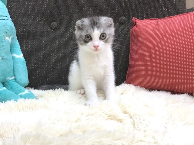 この猫ちゃんは折れ耳スコちゃんです。現在は広々生活スペースで兄妹仲良く毎日生活しています。寝るときはいつも一緒に仲良く寝ています。