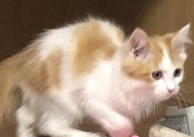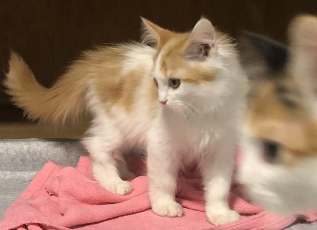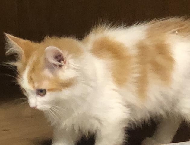 ホワイトとレッド色の優しいカラーのロングコートの子で、グルーミングしてあげると大人になってから膝の上に乗って猫も人も幸せを感じる時間を共有できますよ🎶
