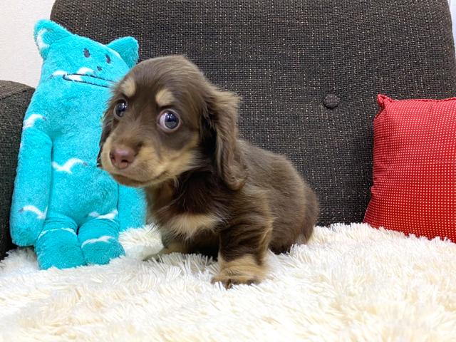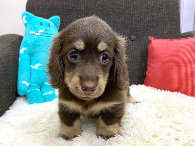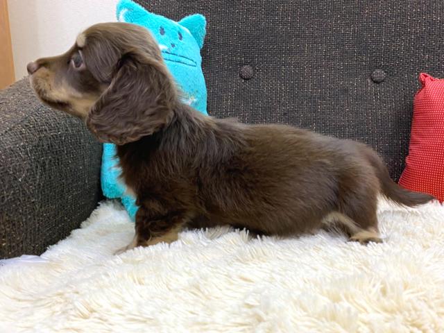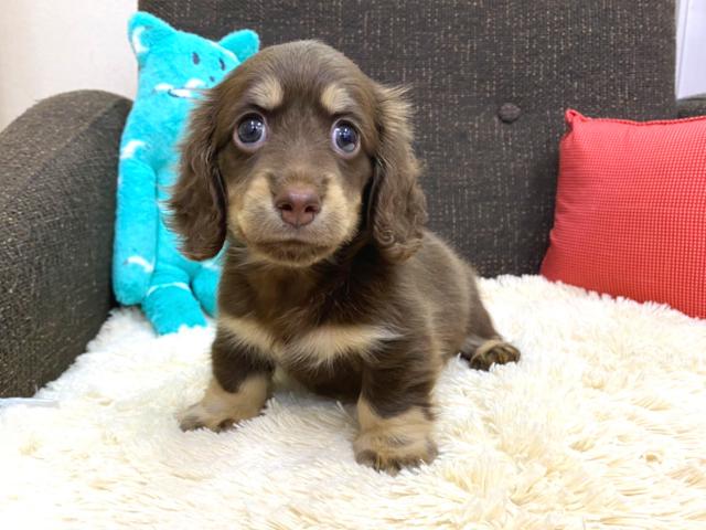 まだまだ小さい手足でトボトボと歩いている様子はとっても可愛いです。性格は温厚でのんびりマイペースに生活しているダックス君ですが、ご飯は大好きですので、ご飯の食いつきは一人前のダックス君です。スタッフが手を差し出すと尻尾を振って喜んでくれる人が大好きなダックス君を是非一度店舗までご見学にお越しくださいね♪すごーく可愛いお顔で癒されますよ♪気になった方はお早めにご連絡いただき、ご見学に来て下さいね♪