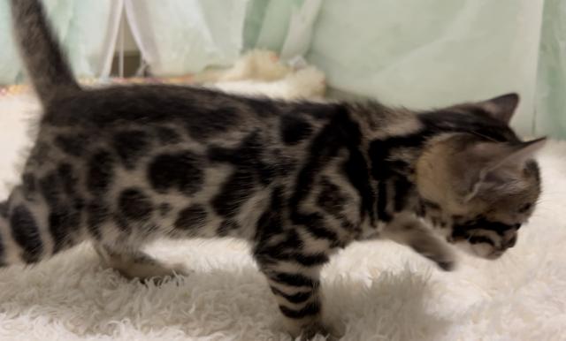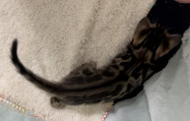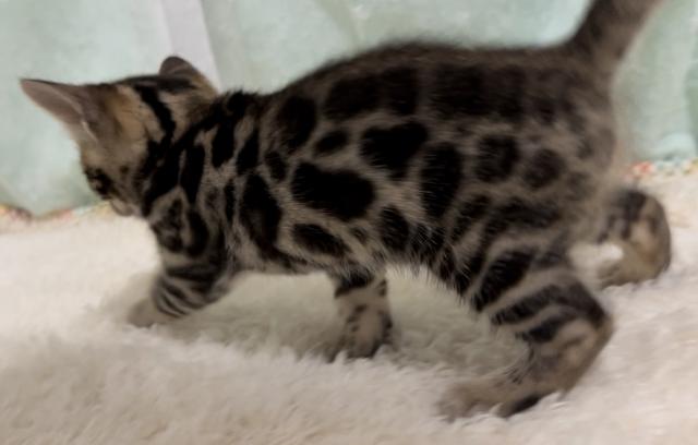 6匹兄妹の中で一番大きいブラウンスポッテッドタビーの元気な男の子です。ブラックの色調が強い母方の系統を継ぐカッコいいオスに成長すると思います。ベンガルらしい顔立ちで、ロゼットの配置も良くお薦めの一匹です。立派なベンガルになりそうなのでキングくんと呼んでいます。