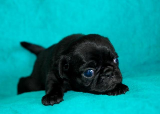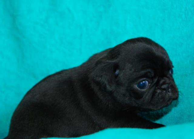 コンパクトでムチムチした子犬らしい体型が可愛い黒パグの女の子です。