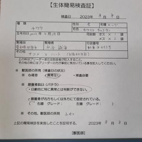 両親共に遺伝子検査(PRA)クリアしてますのでこの子に網膜萎縮症は発症しませんのでご安心下さい。