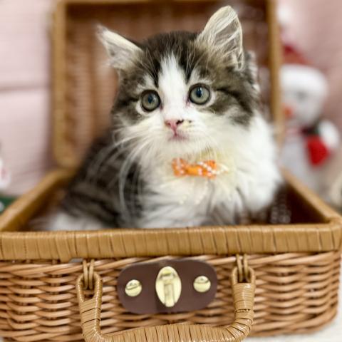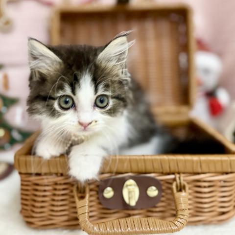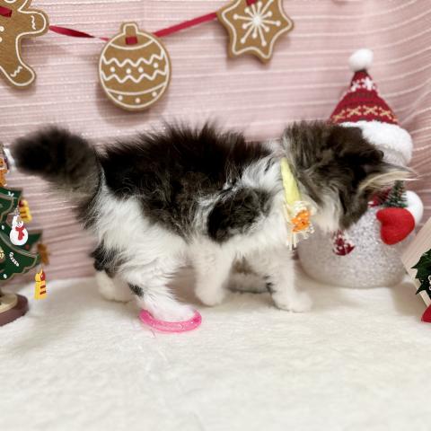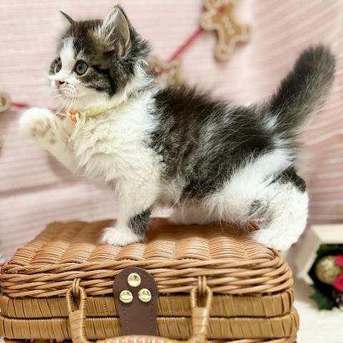 深いブラウンに白がよく映えるきれいなツートンカラー✨お鼻横のちいさなゴマ模様と、ぴょこんと伸びた耳の毛が愛らしさを引き立てます✌️