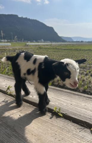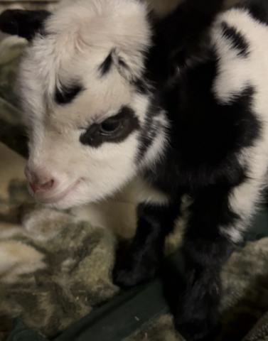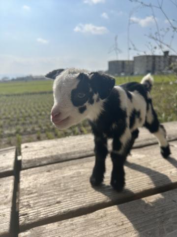 牛柄(ブラック&ホワイトのスポッテッド)の赤ちゃんヤギが誕生しました。