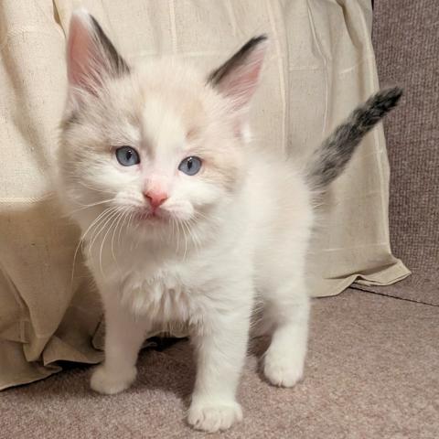 足長の男の子のご紹介です。お父さんが短足のマンチカンでお母さんがラグドールになります。最近はカリカリも食べ始め、まんまるフワフワになってきました。お母さんがおっとりしているのでこの子もおっとりしていてかわいいです。お引渡しはワクチンが済んだ後体調が良い時で、2026年の1月の初旬から中旬頃になると思います。