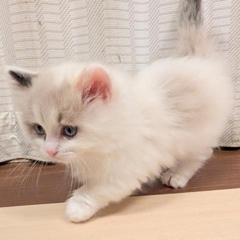 短足の女の子のご紹介です。お父さんが短足のマンチカンでお母さんがラグドールになります。最近はカリカリも食べ始め、まんまるフワフワになってきました。お母さんがおっとりしているのでこの子もおっとりしていてかわいいです。傍へ寄って来て遊んでくれますしお膝の上でくつろいでくれる良い子です。お引渡しはワクチンが済んだ後体調が良い時で、2026年の1月の初旬から中旬頃になると思います。