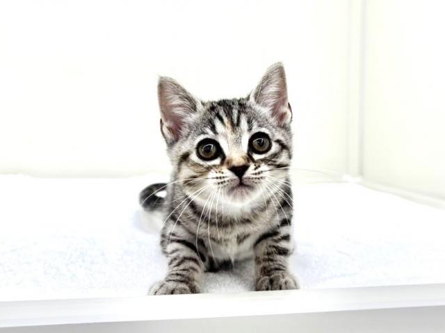 毛色はシルバーパッチドタビー。淡いシルバーをベースに、ふんわりと入った模様がとても上品で、光の当たり方によって表情が変わるのも魅力のひとつです!(*´艸`*)