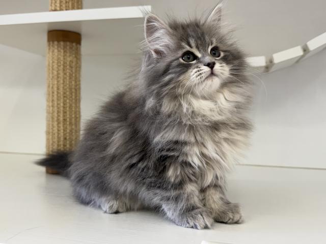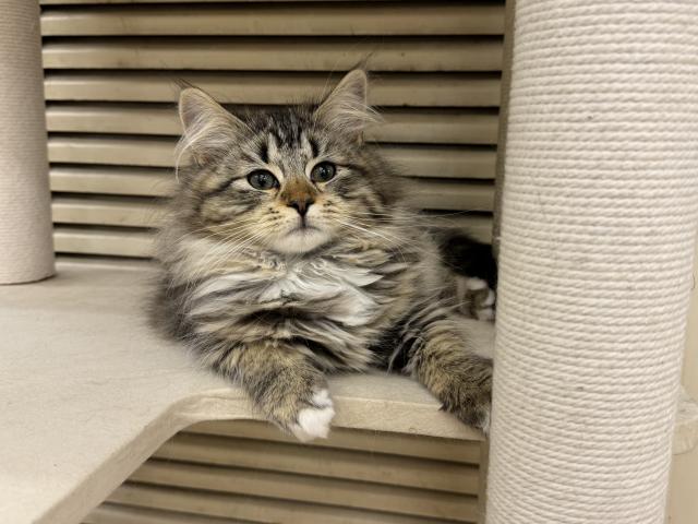ふんわりとした豊かな被毛と、丸みのある愛らしいお顔が魅力のブルータビーの女の子です。