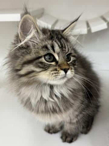 しっかりとした骨格に、ふわふわと豊かな被毛をまとったブラウンタビーの男の子です。