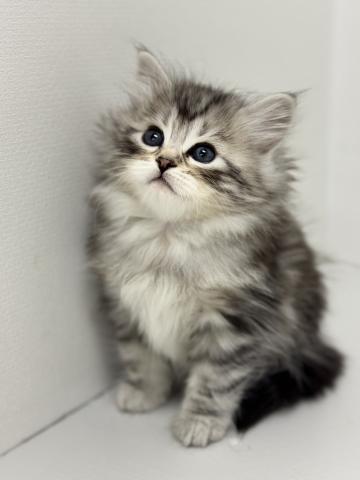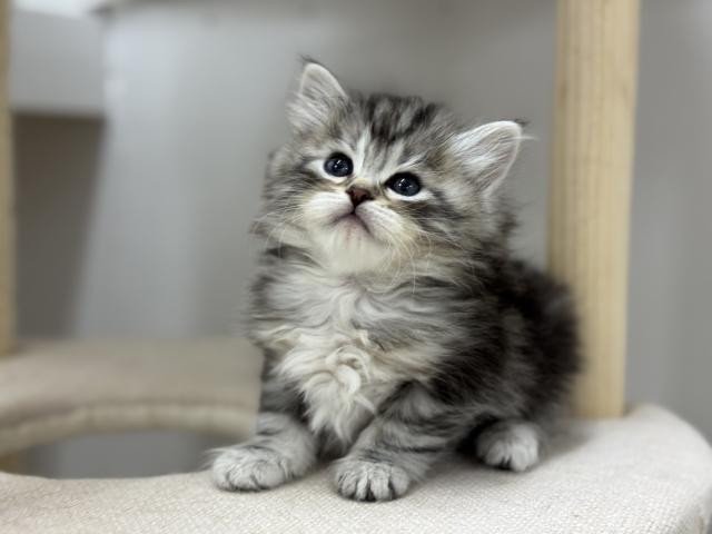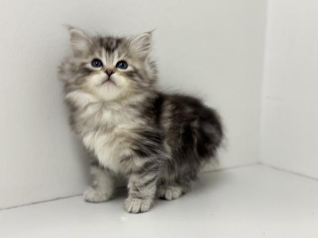 やわらかなシルバーの被毛に、美しいタビー模様が映える男の子です。