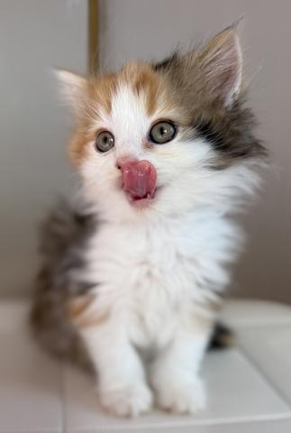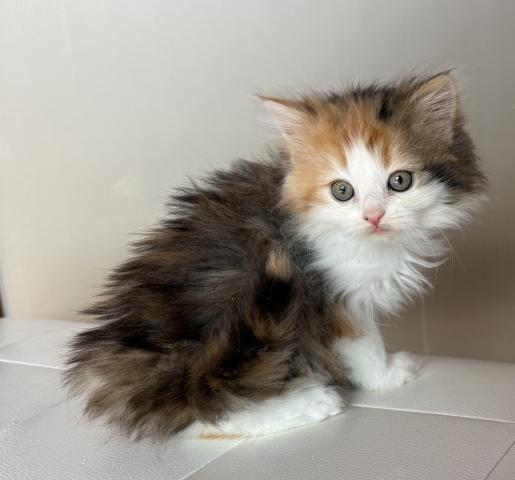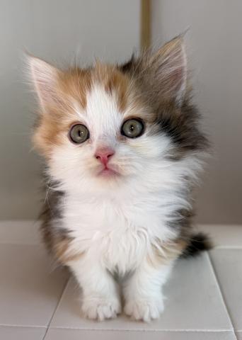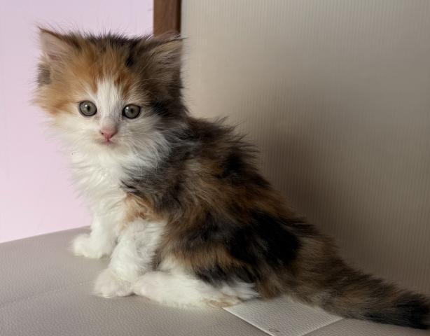 毛がとっても長いフワフワのキャリコのサイベリアンの赤ちゃんです。キャリコといっても、ブラックやブラウンの部分はホワイトの毛が混ざっていてブルーとクリームぽくなってますので、ダイリュートキャリコでも血統書登録可能です。まだヨチヨチしてます。
