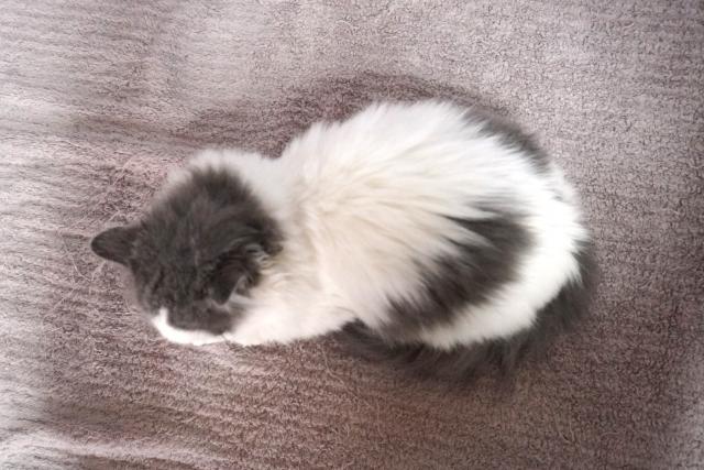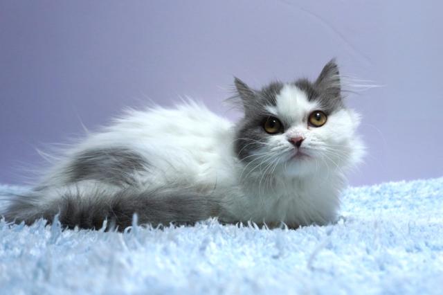 人気のブルー&ホワイト。ま~るいお顔にフワフワのロングコートがいいですね。
