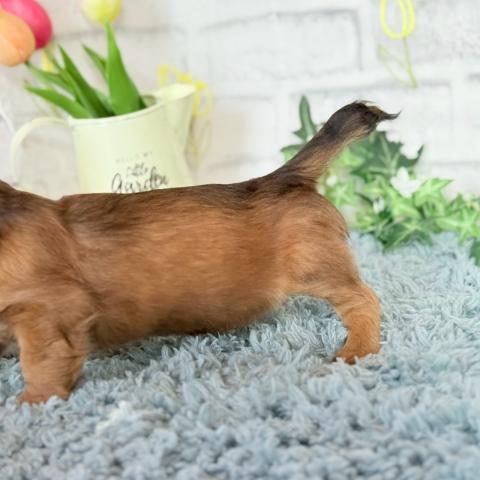 お父さん犬はミニチュアダックスロング(5kg,ゴールド)お母さんはミニチュアダックスロング(5.5kg,ブラックタン)の両親から産まれた女の子💞です。たんたんちゃんの尻尾は少し短くおまがりしている特徴があります。おまがりが気にならない方に是非可愛がって頂きたいです💕2月26日以降見学可能です😊是非見学に来てください💕