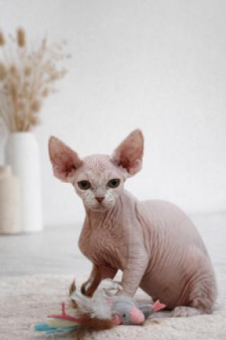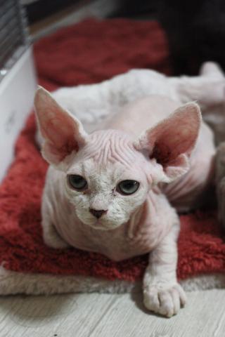 ホワイトカラーが美しく、被毛が少なめなことでデボンレックスらしいなめらかな肌質が際立つ男の子です。