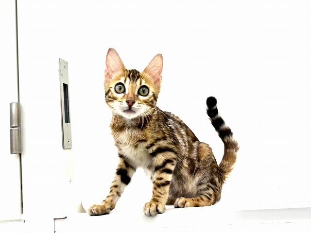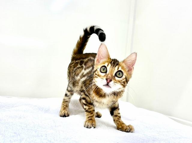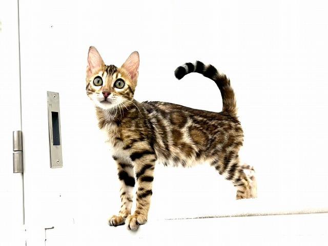 キラキラと輝く美しい被毛が目を引くベンガルの男の子(=^・ω・^=)
