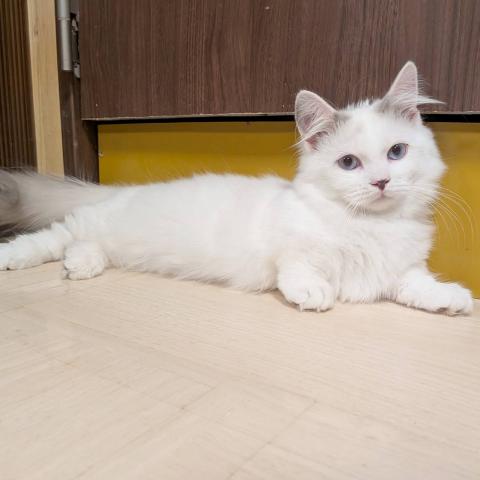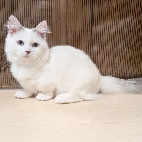 短足の男の子のご紹介です。兄妹や他の子猫達とじゃれて遊ぶのが大好きな、とても元気な男の子です。瞳がブルーで綺麗です。カラーは全体的にホワイトですが、頭の部分に淡いブルーポイントの柄があり珍しく希少性があります。しっかりご飯も食べ丸々としています。ご見学当日のお引渡しが可能です。