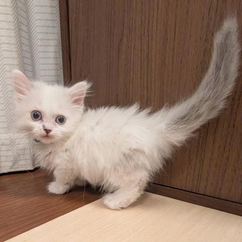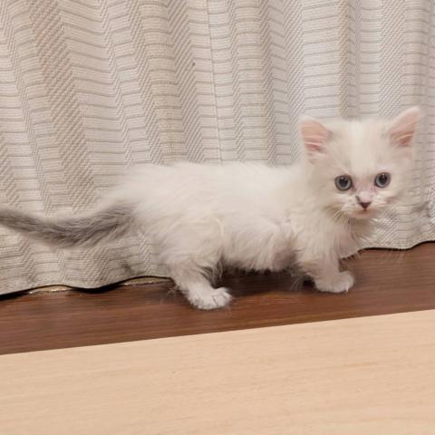 短足の女の子のご紹介です。小さな体で一生懸命遊んでいる姿は本当にかわいいものです。性格は、抱っこされても大人しく、お客様の膝の上でくつろいだり寝たりしてくれます。カラーもブルーポイントといって珍しく希少性があります。瞳がブルーで、これからどんな風に成長するのかとても楽しみな子です。ワクチンを接種してからのお引渡しとなります。