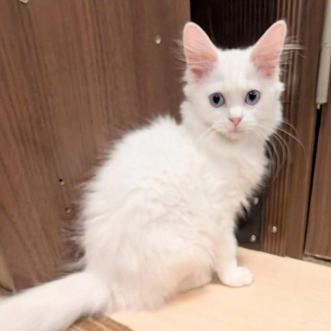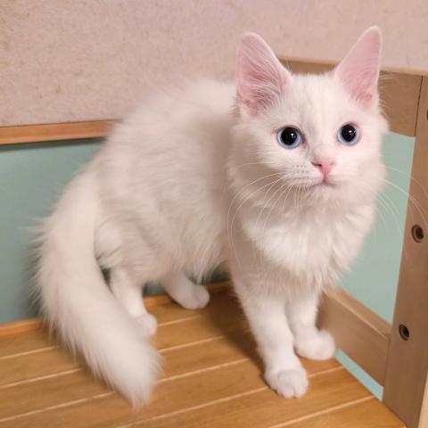 足長の男の子のご紹介です。真っ白で瞳がブルーのイケメン君です。ロングヘアーでフワフワなのがまた魅力的です。他の子猫達と共に仲良く過ごしております。訳がありお安くしてあります。気になる方はお問い合わせ下さい。ご見学当日のお引渡しが可能です。