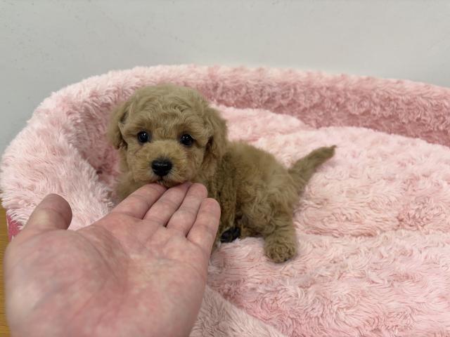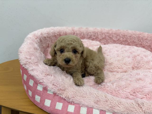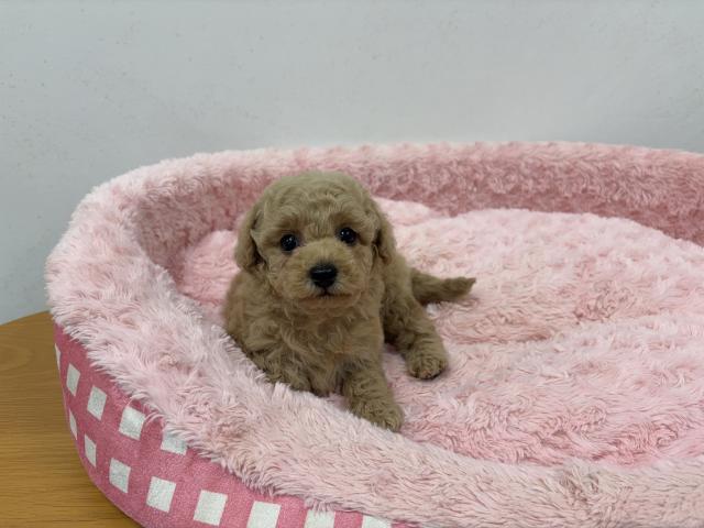 毛量も豊富でふんわりとしており、綺麗なアプリコットカラーがとても似合う子です。トイプードルちゃんらしいカットが非常によく似合います。