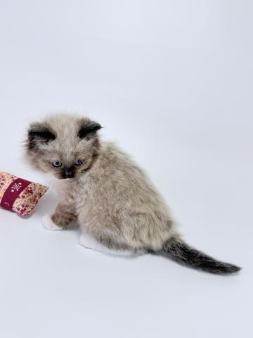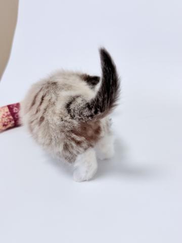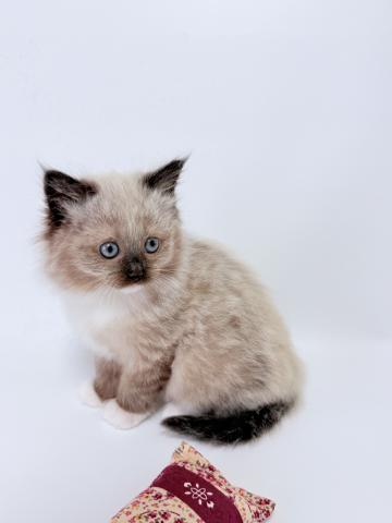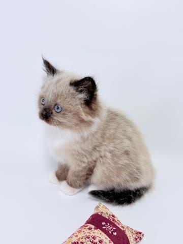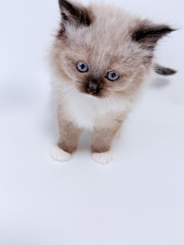 ネヴァマスカレードの中でも王道のカラー、シールポイントですが、前足は「白い手袋」、後ろ足は「白いソックス」を履いているような愛らしい見た目をしています。