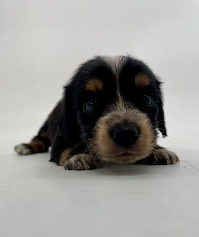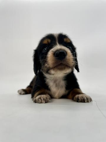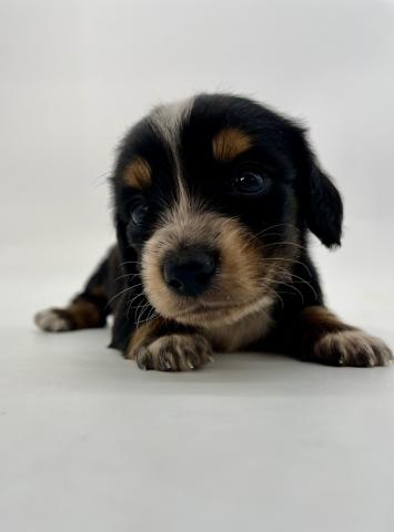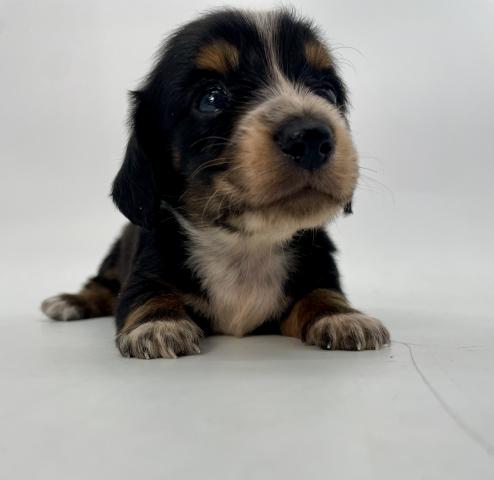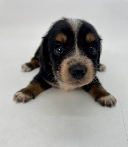 黒をベースに、すっと入った白いブレーズが印象的なパイボールドのダックスの赤ちゃんが誕生しました。