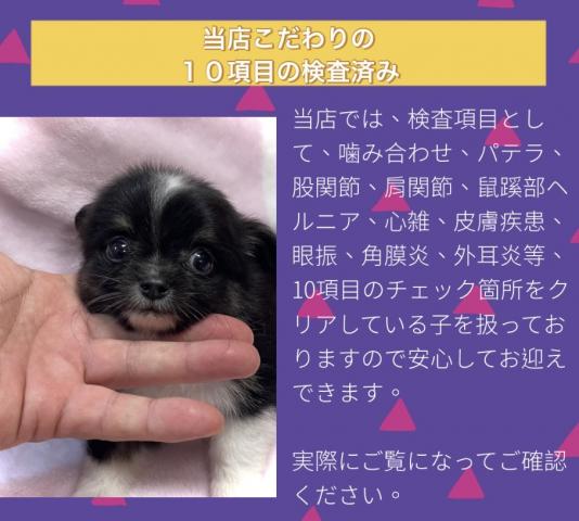 当店では、検査項目として、噛み合わせ、パテラ、股関節、肩関節、鼠蹊部ヘルニア、心雑、皮膚疾患、眼振、角膜炎、外耳炎等、10項目のチェック箇所をクリアしている子を扱っておりますので安心してお迎えできます。