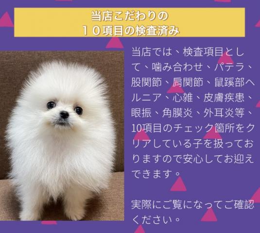 当店では、検査項目として、噛み合わせ、パテラ、股関節、肩関節、鼠蹊部ヘルニア、心雑、皮膚疾患、眼振、角膜炎、外耳炎等、10項目のチェック箇所をクリアしている子を扱っておりますので安心してお迎えできます。