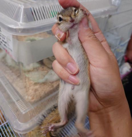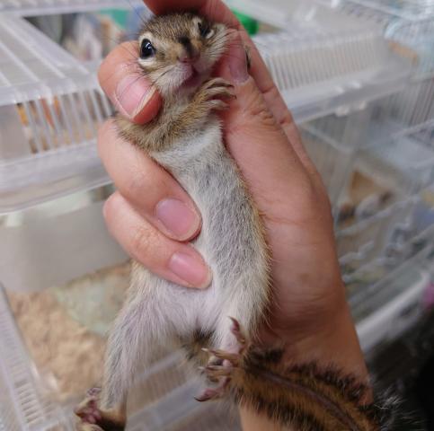当店店長はリスを得意としておりまして、国内では珍しくなったホワイトシマリス(縞模様があるタイプのもの)を繁殖しています。タイミングによってはノーマル、アルビノ、ホワイトと揃います。シマリスファン必見です。