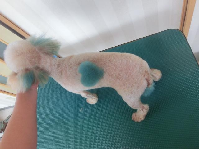 体にバリカンをいれたので、背中のハートがきれいに