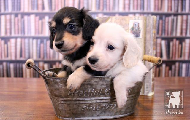 珍しい白いダックスの男の子と正統派美人ブラックタンの女の子です。
